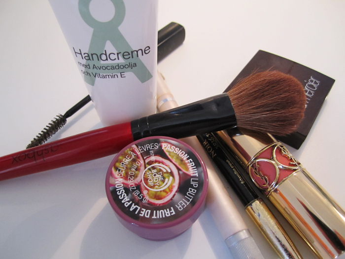 Jag går inte till jobbet utan att ha de här produkterna i väskan: Handkräm Åhléns, rougeborste Smashbox, rouge Laura Mercier, concealerpenna Loréal, svarta kajal från Lancôme, lip butter The Body Shop, läppstift YSL och hemmagjord ögonbrynsborste av gammal Lancôme-mascaraborste.