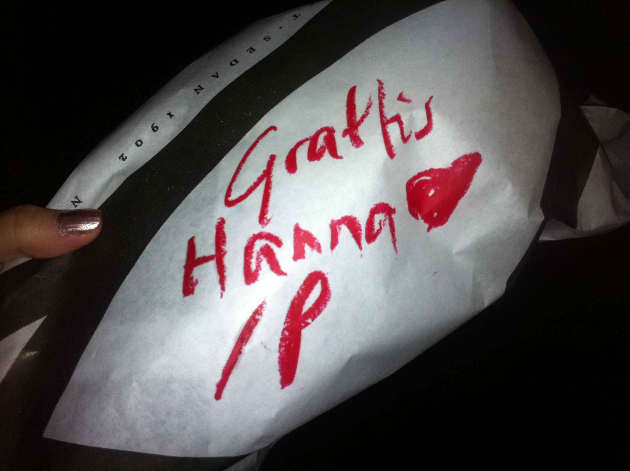 Fick skriva med läppstift på bukettpappret i taxin, hade glömt kort. Det ser ut som något en shabby chic-aktivist skulle ha gjort medvetet. Men rosorna, jag ville verkligen inte ge ifrån mig dem. Hoppas du är tacksam, HANNA!